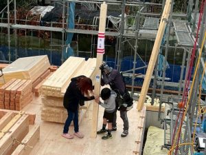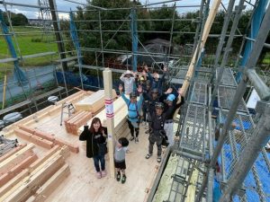 作業前にはお施主様(奥様とお子様)にお越し頂き1本目の柱建てを行いました😊